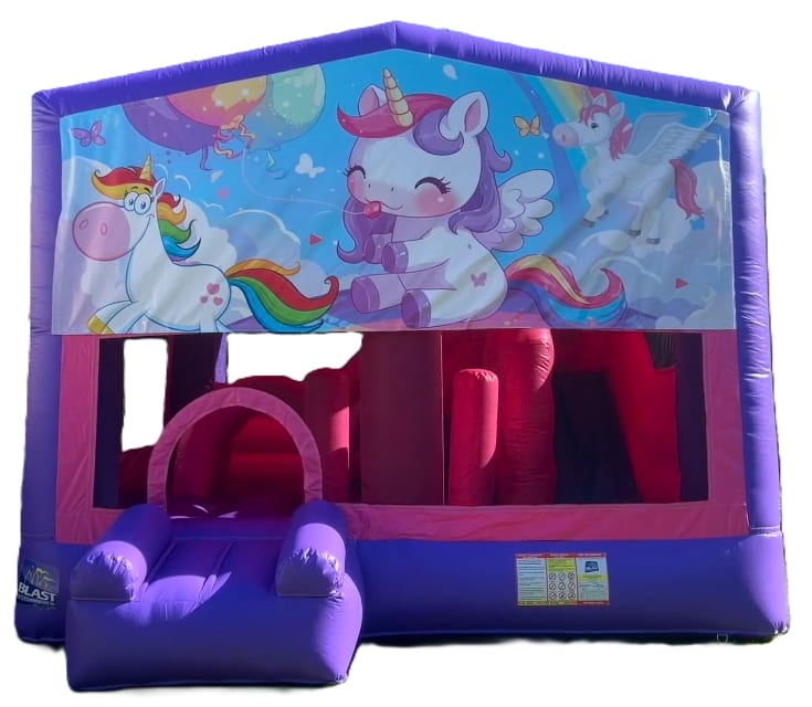 Transform any event into a magical wonderland with our 5x5 Unicorn Obstacle Slide. Perfect for birthdays, community events, or any special occasion, this enchanting inflatable offers hours of delightful fun for kids of all ages. With its vibrant unicorn theme, exciting obstacles, and fast slide, it's the ultimate attraction that guarantees smiles and laughter.