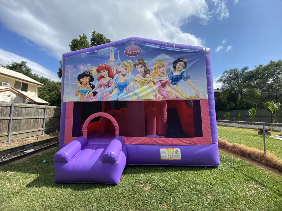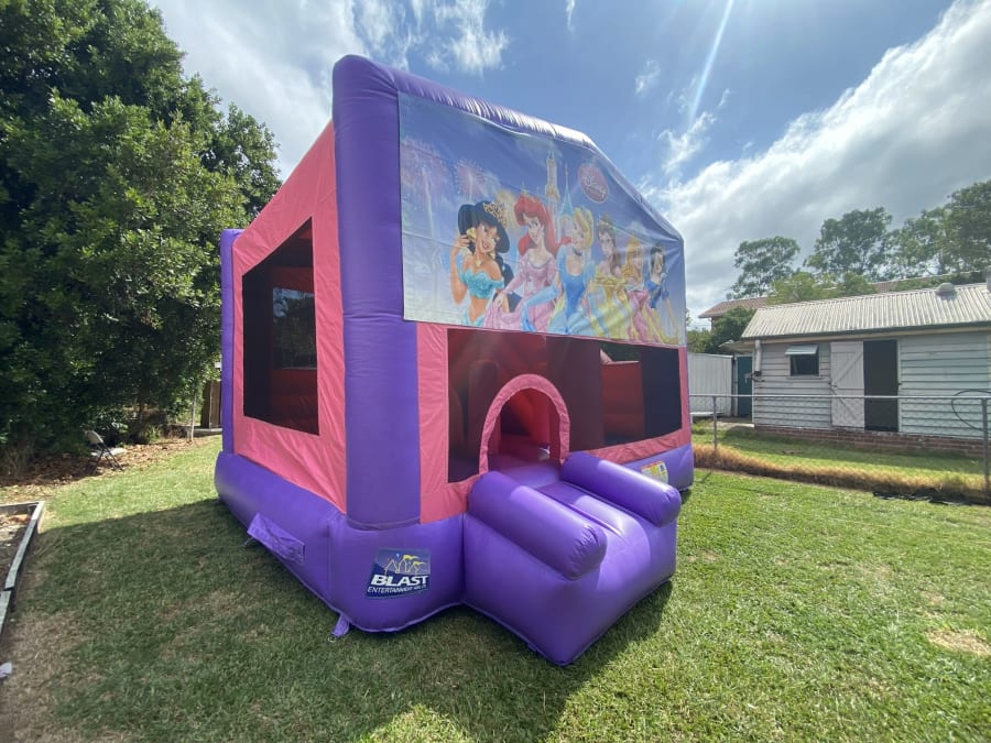 Make any party magical with our 5x5 Pink Princesses Obstacle Slide. This princess-themed pink jumping castle combines a large jumping area, slide, obstacle course, basketball hoop and rain/shade cover. Perfect for birthdays, community events and backyard fun in Brisbane. Book reliable Jumping Castle Hire Brisbane 5x5 Pink Princesses Obstacle Slide in Brisbane today. π