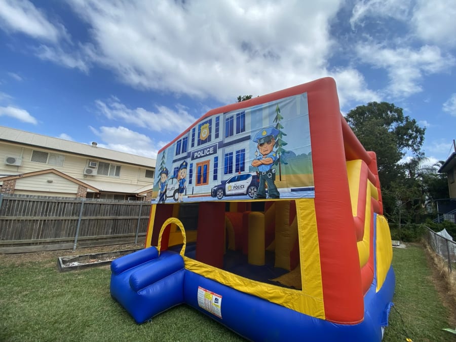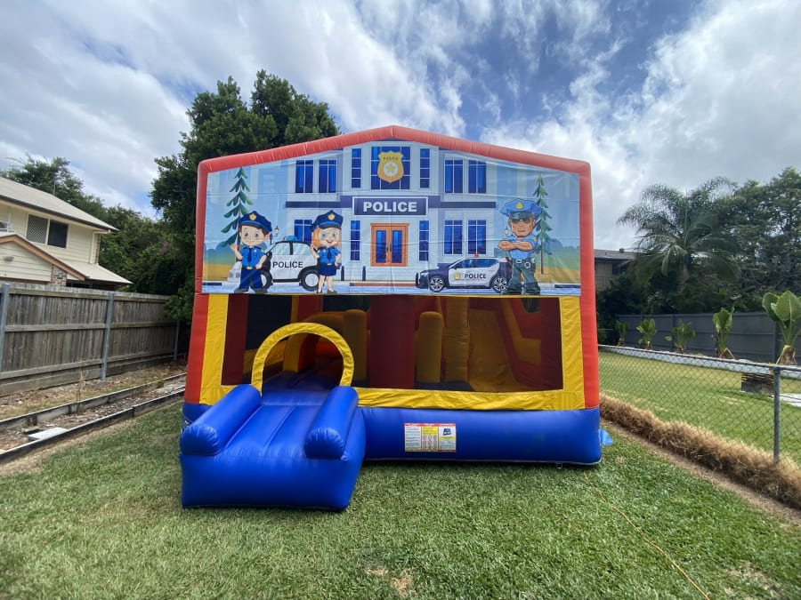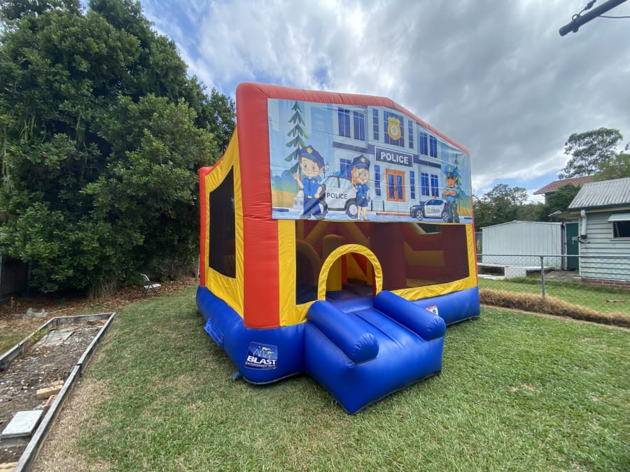 Jumping Castle Hire 5x5 Police Obstacle Slide in Brisbane delivers a safe, themed playzone that excites kids and eases party planning. This 5x5m police-themed jumping castle combines a slide, obstacle course, large jumping area and a basketball hoop under a rain/shade cover. Perfect for backyard parties, school events and community days. π‘π«
