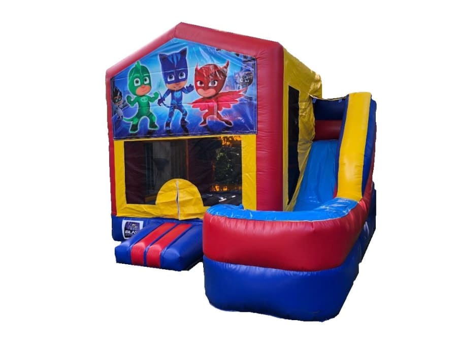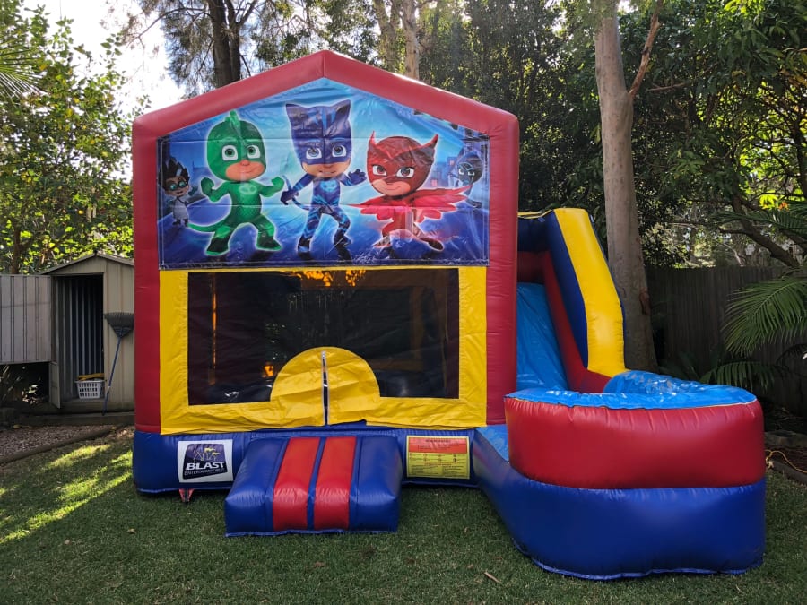 PJ Masks, we're on our way! It's time to put on your pajamas, activate your superpowers, and bounce into action with Catboy, Owlette, and Gekko in this PJ Mask Themed Jumping Castle With Slide. This jumping castle hire Brisbane is the ultimate destination for heroic adventures, friendly competitions, and imaginative fun. PJ Masks, it's time to be a hero!