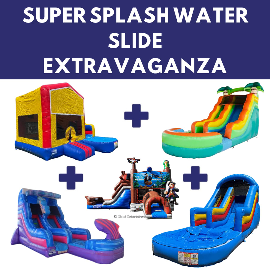 Lock in the Super Splash Water Slide Extravaganza for your next event and enjoy stress-free jumping castle and water slide hire with big splash fun.